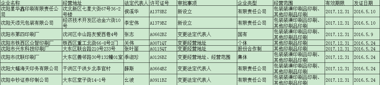印刷企业审批(2016年5月)