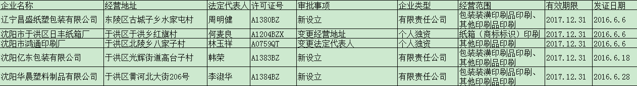 印刷企业审批(2016年6月)