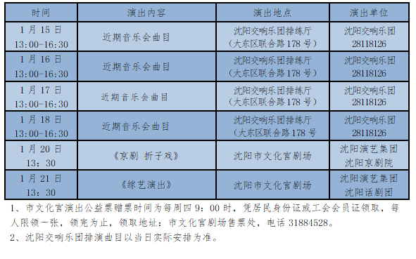 沈阳演艺集团、沈阳交响乐团1月15日—21日惠民演出安排