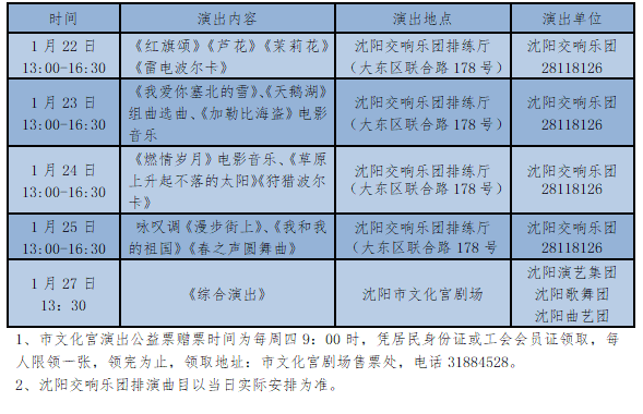 沈阳演艺集团、沈阳交响乐团1月22日—27日惠民演出安排